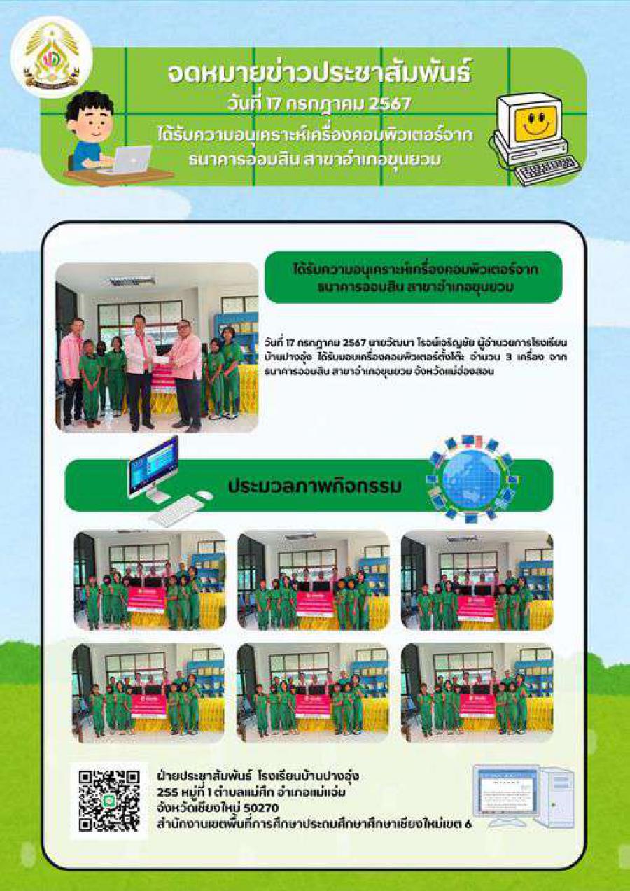 วันที่ 17 กรกฎาคม 2567 นายวัฒนา โรจน์เจริญชัย ผู้อำนวยการโรงเรียนบ้านปางอุ๋ง ได้รับมอบเครื่องคอมพิวเตอร์ตั้งโต๊ะ จำนวน 3 เครื่อง จากธนาคารออมสิน สาขาอำเภอขุนยวม จังหวัดแม่ฮ่องสอน