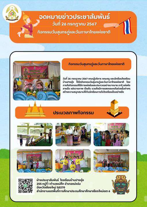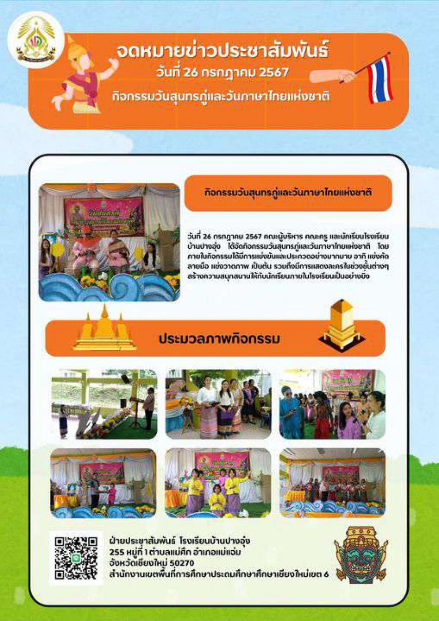 วันที่ 26 กรกฎาคม 2567 คณะผู้บริหาร คณะครู และนักเรียนโรงเรียนบ้านปางอุ๋ง ได้จัดกิจกรรมวันสุนทรภู่และวันภาษาไทยแห่งชาติ โดยภายในกิจกรรมได้มีการแข่งขันและประกวดอย่างมากมาย อาทิ แข่งคัดลายมือ แข่งวาดภาพ