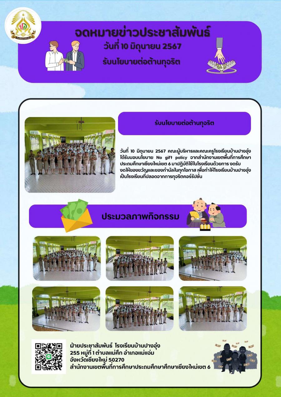 โรงเรียนบ้านปางอุ๋ง โดยคณะผู้บริหาร คณะครูและบุคลากรทางการศึกษาและนักเรียนร่วมกันจัดกิจกรรมรณรงค์ต้อนทุจริต ประจำปีการศึกษา 2567