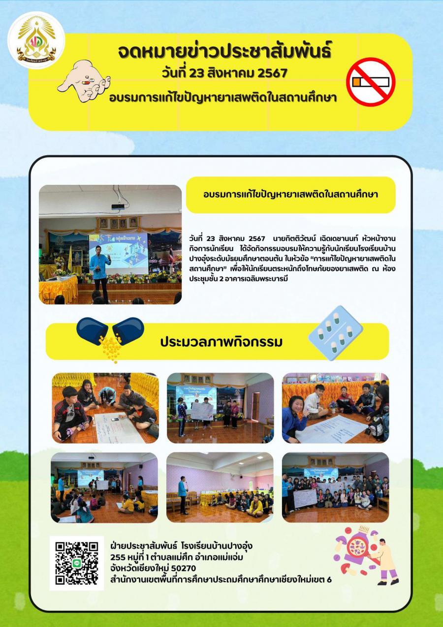 วันที่ 23 สิงหาคม 2567 นายกิตติวัฒน์ เฉิดเดชานนท์ หัวหน้างานกิจการนักเรียน ได้จัดกิจกรรมอบรมให้ความรู้แก่นักเรียน ระดับชั้นมัธยมศึกษาตอนต้น ในหัวข้อ การแก้ไขปัญหายาเสพติดในสถานศึกษา เพื่อให้นักเรียนตร