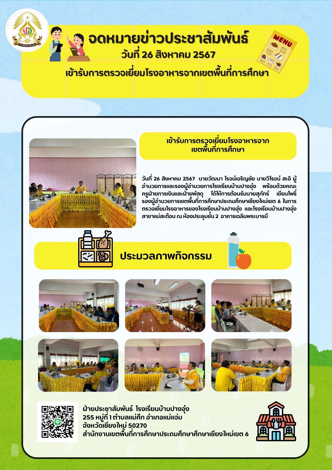 วันที่ 26 สิงหาคม 2567 นายวัฒนา โรจน์เจริญชัย ผู้อำนวยการโรงเรียนบ้านปางอุ๋ง พร้อมด้วยคณะครู โรงเรียนบ้านปางอุ๋ง และโรงเรียนบ้านปางอุ๋ง สาขาแม่สะต๊อบ ให้การต้อนรับการตรวจเยี่ยมการดำเนินโครงการอาหารกลา
