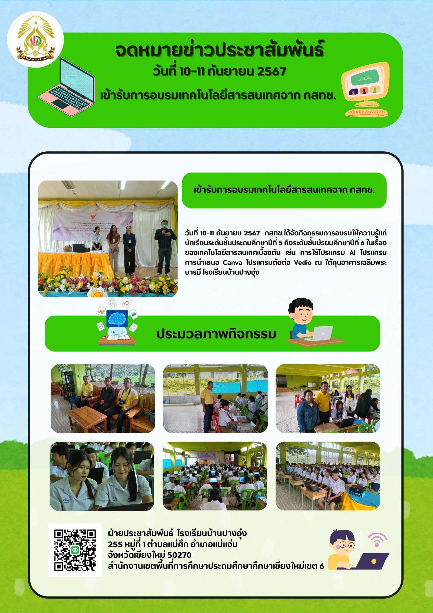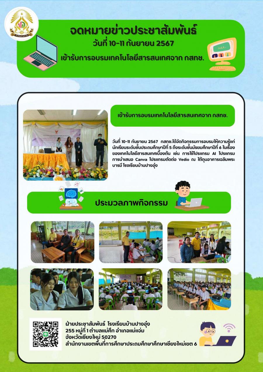 10-11/09/2567 โรงเรียนบ้านปางอุ๋ง ร่วมกับ กสทช. จัดกิจกรรมอบรมเชิงปฏิบัติการ เรื่อง การใช้เทคโนโลยีสารสนเทศเบื้องต้น ให้แก่นักเรียนระดับชั้นประถมศึกษาปีที่ 5 ถึง ชั้นมัธยมศึกษาปีที่ 6