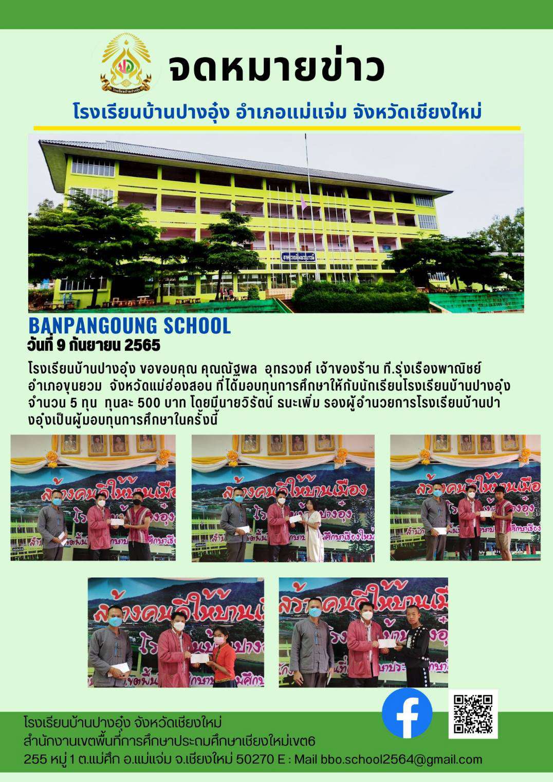 โรงเรียนบ้านปางอุ๋ง ขอขอบคุณ คุณณัฐพล อุทธวงศ์ เจ้าของร้าน ที.รุ่งเรืองพาณิชย์ อำเภอขุนยวม จังหวัดแม่ฮ่องสอน ที่ได้มอบทุนการศึกษาให้กับนักเรียนโรงเรียนบ้านปางอุ๋ง จำนวน 5 ทุน ทุนละ 500 บาท