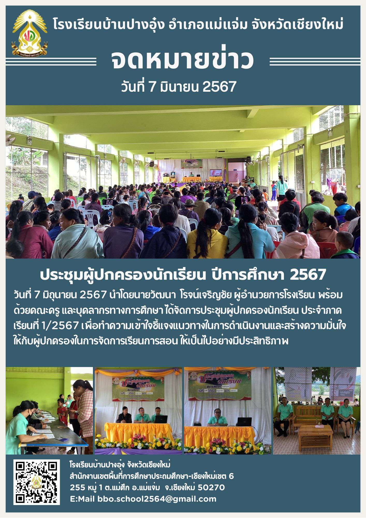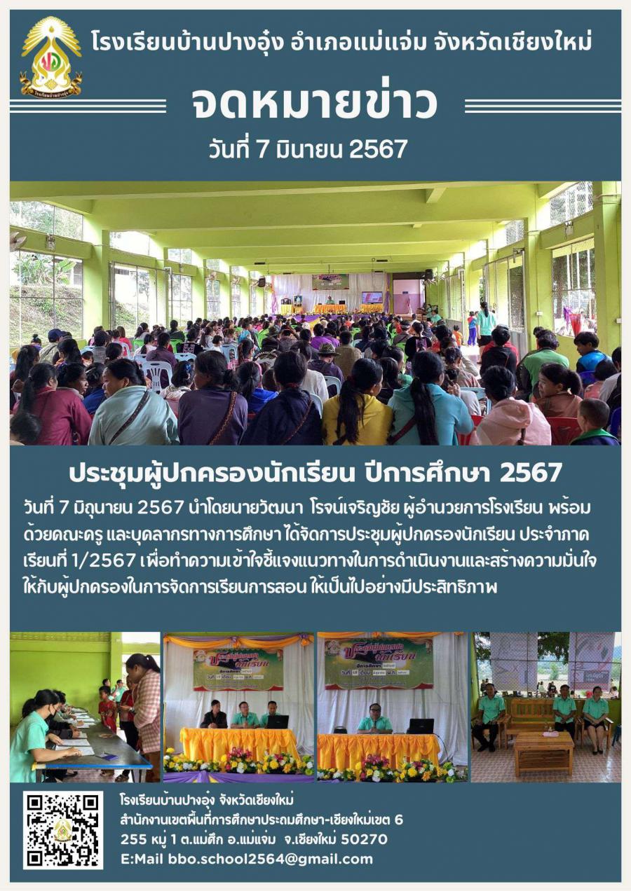 จัดการประชุมผู้ปกครองนักเรียน ประจำภาคเรียนที่ 1/2567 เพื่อทำความเข้าใจชี้แจงแนวทางในการดำเนินงานและสร้างความมั่นใจให้กับผู้ปกครองในการจัดการเรียนการสอน ให้เป็นไปอย่างมีประสิทธิภาพ