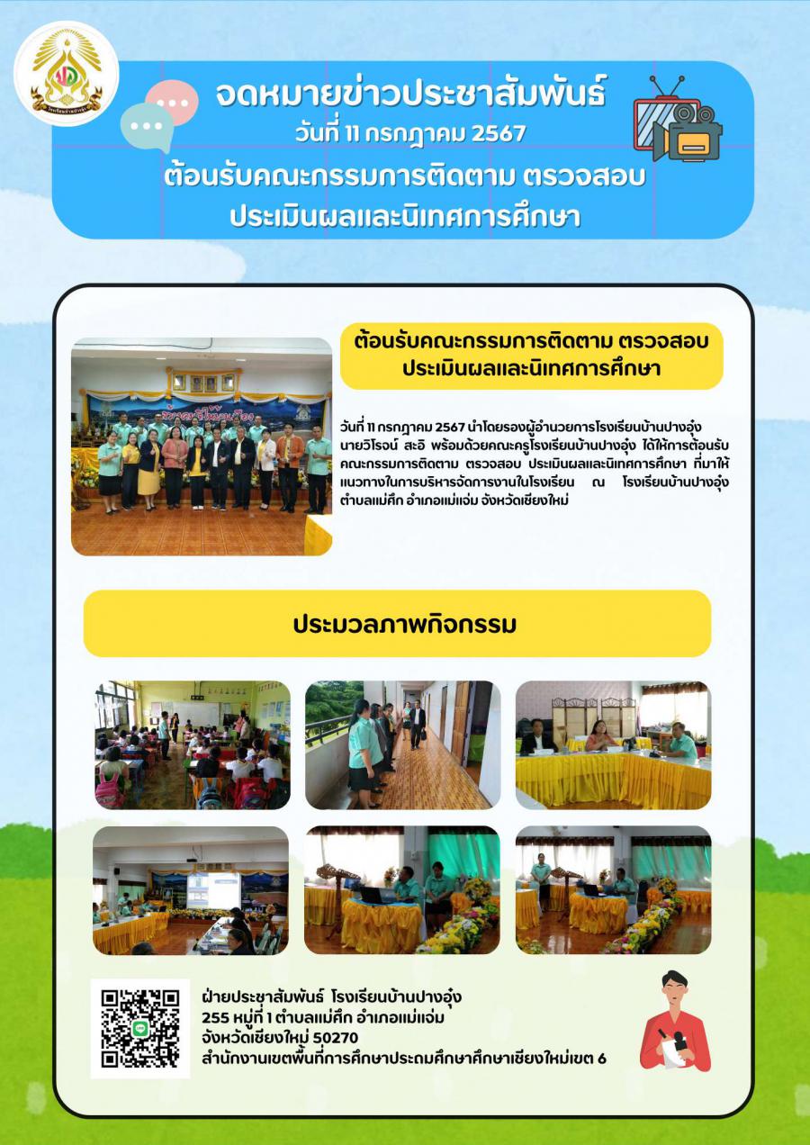 วันที่ 11 กรกฏาคม 2567 โรงเรียนบ้านปางอุ๋ง นำโดยนายวิโรจน์ สะอิ รองผู้อำนวยการโรงเรียนบ้านปางอุ๋ง พร้อมด้วยคณะครูโรงเรียนบ้านปางอุ๋ง ได้ให้การต้อนรับ คณะกรรมการติมตาม ตรวจสอบ ประเมินผลและนิเทศการศึกษา