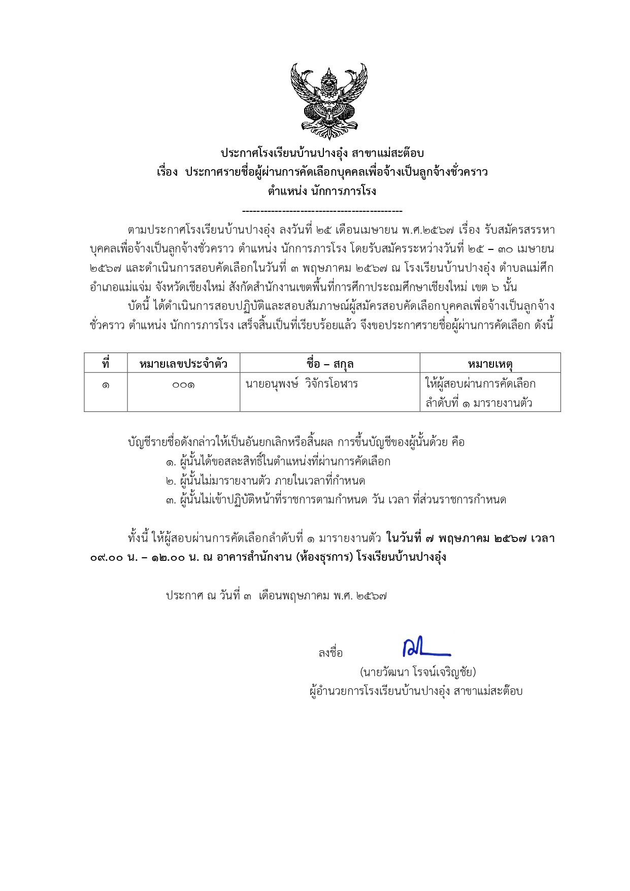 ประกาศรายชื่อผู้ผ่านการคัดเลือกบุคคลเพื่อจ้างเป็นลูกจ้างชั่วคราว ตำแหน่งนักการภารโรง
